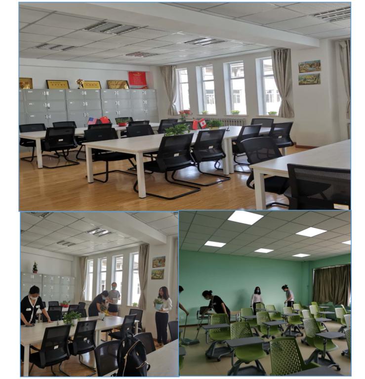 7月10日下午2点,英语专业党支部举行“窗明几净 风清气正”主题党日活动,在支部书记王丽的带领下,段晓茜、于巧峰、高媛媛、曾曾等党员同志将英语系教研室及弘毅楼智慧教室进行了重新布置和彻底清扫,为英语专业招生宣传片营造了整洁、美观的拍摄环境。