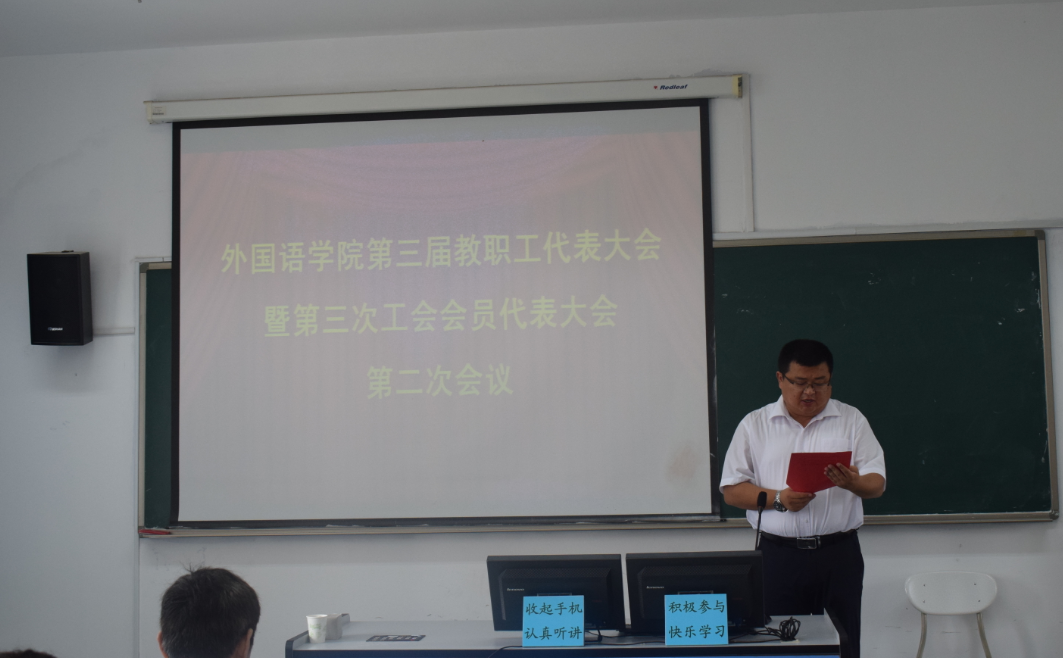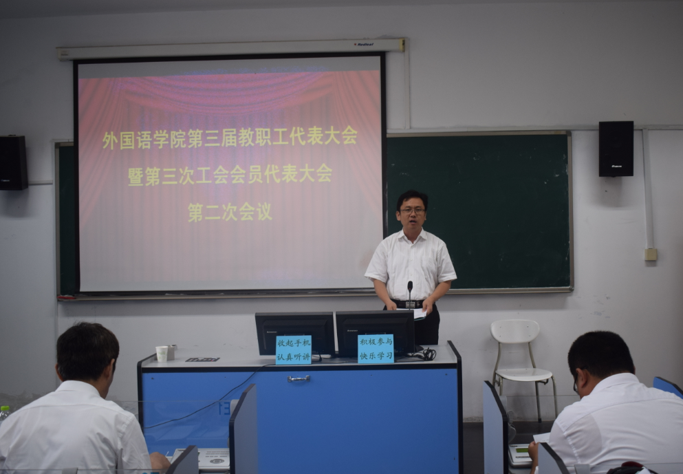 2019年7月17日,澳门信誉最好十大平台第三届教职工代表大会暨第三次工会会员代表大会第二次会议在418语音室召开,应到代表60人,实到52人。会议由党总支副书记兼副院长宋飞主持。