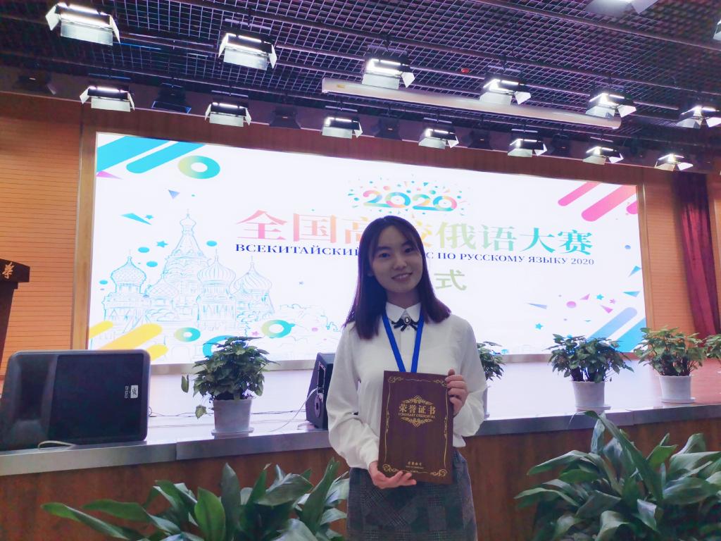 10月24-25日,由教育部主办、黑龙江大学承办的2020年全国俄语大赛复赛和决赛阶段在哈尔滨举行。我校澳门信誉最好十大平台俄语系学生在此次俄语大赛上再创佳绩。2017级卢冬雪同学获得高年级组三等奖,同时获得国家留学基金管理委员会秘书处全额资助赴俄罗斯攻读学位资格。2019级金黎杰同学获得低年级组优胜奖。