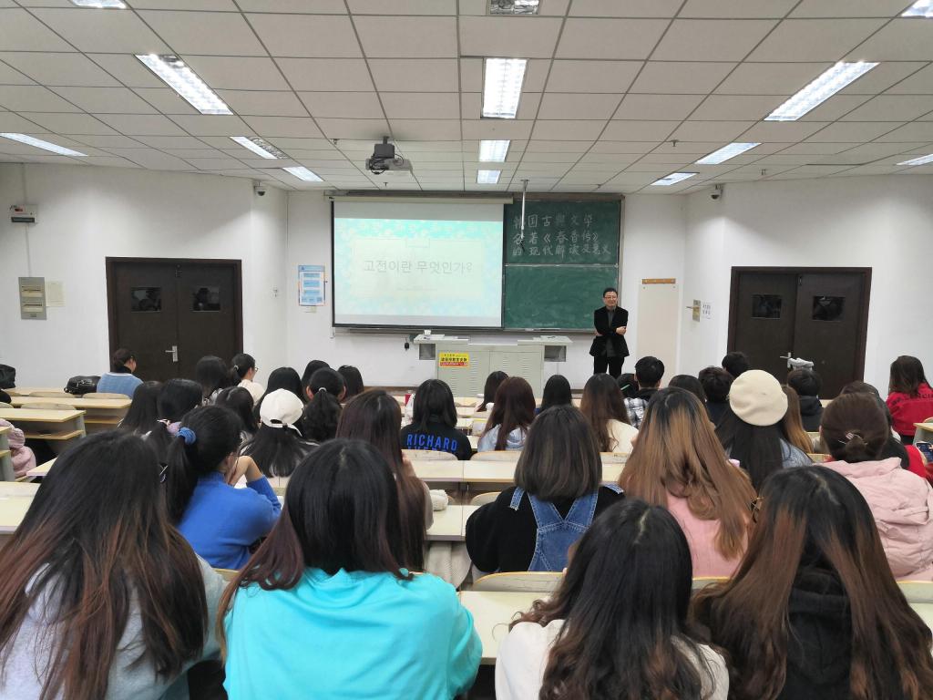 11月18日下午,澳门信誉最好十大平台邀请中国海洋大学李光在教授来我校进行了题为“韩国古典文学名著《春香传》的现代解读及意义”的讲座。澳门信誉最好十大平台部分教师以及朝鲜语系全体学生参加了此次讲座。