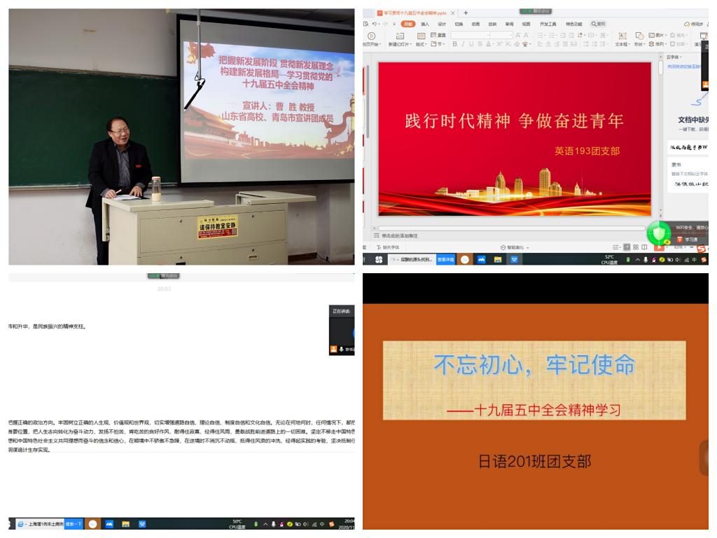 教职工广泛深入学,实现学习全覆盖 11月13日上午,学院通过集体收看和个人收看相结合的方式,组织学院师生观看学习贯彻党的十九届五中全会精神中央宣讲团报告会视频。11月24日下午,学院召开全体教职工大会集体学习党的十九届五中全会精神,学院党委书记曲斌艳向全院教职工传达了山东省政协党组成员、副主席韩金峰来校宣讲党的十九届五中全会精神的报告内容。各党支部也组织广大师生通过学习强国平台深入学习全会精神。多途径、多形式的学习方式实现教职工全会精神学习的全覆盖。