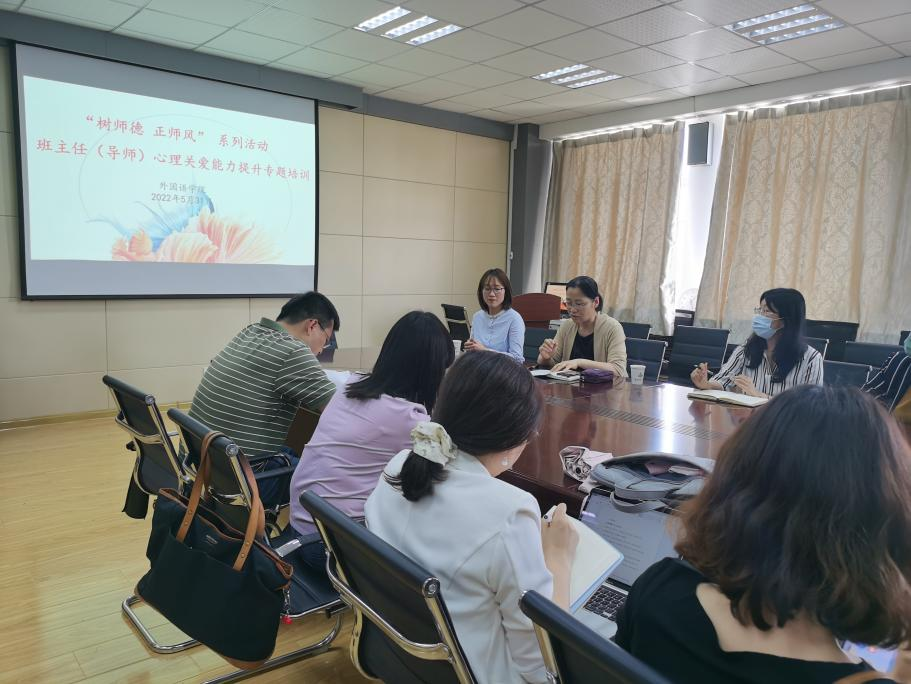 2022年5月31日下午,澳门信誉最好十大平台“树师德 正师风”系列活动——教师心理关爱能力提升专题培训在学院517会议室进行,学院邀请校心理健康教育与研究中心主任李海玲为学院全体系部主任、班主任(导师)进行相关培训。