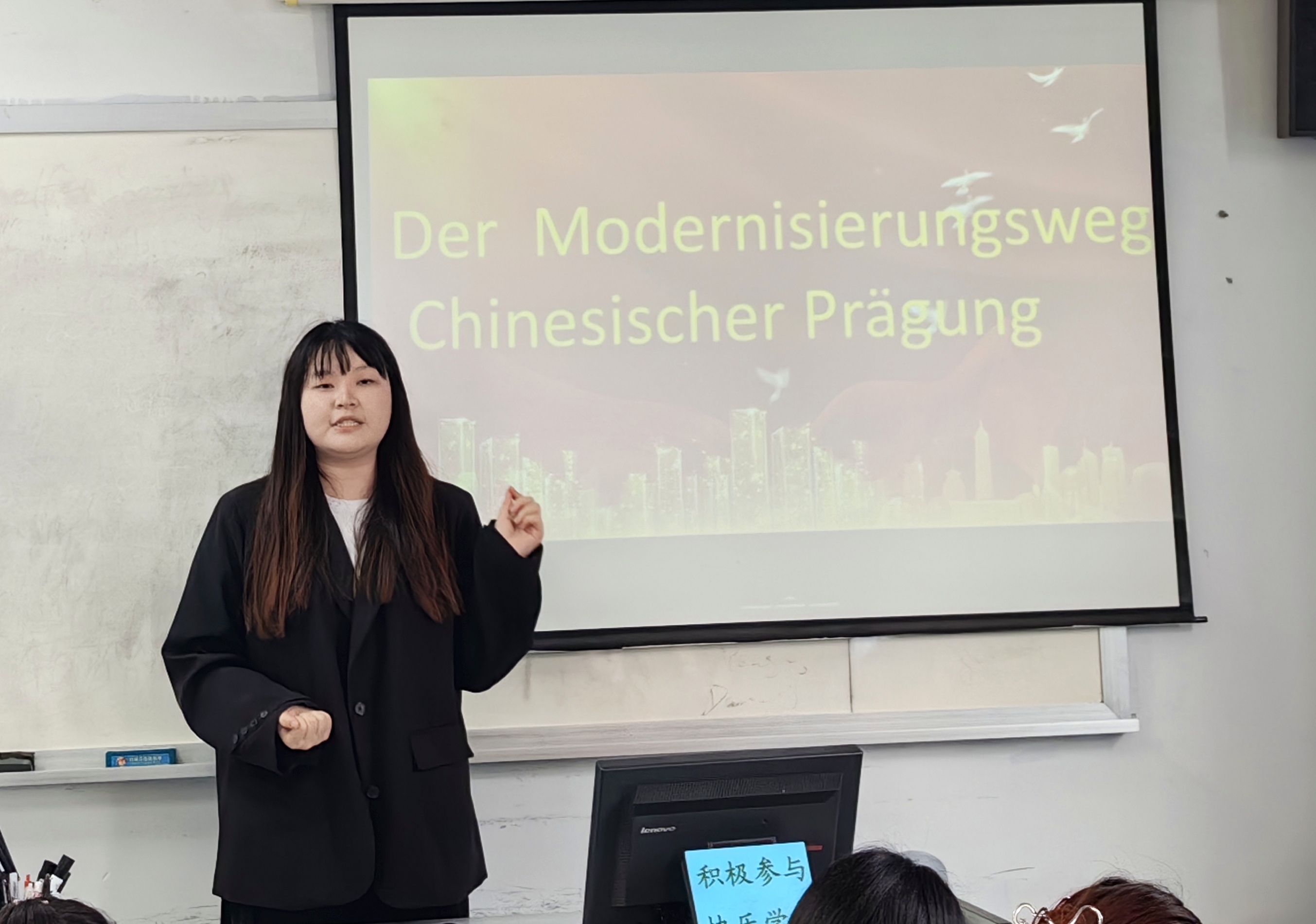首先开始的是德语演讲比赛:多位同学围绕“中国式现代化道路”这一主题在阐明理论的基础上抒发了年青一代的使命感:袁舒涵同学的演讲带我们了解了中国式现代化的核心内容;张浩然同学重点讲述了她对作为中国共产党奋斗目标的“共同富裕”的理解;陈萱同学认为人与自然和谐共生充分体现了中国式现代化的核心内容;高丽同学也强调了生态文明关乎人类未来,青年一代应该担负起生态文明建设的责任;刘璇、任妍琦、吴黄婷三位同学的演讲告诉我们,青年强则国强,号召年轻一代在中国式现代化道路上积极作为,担当重任。