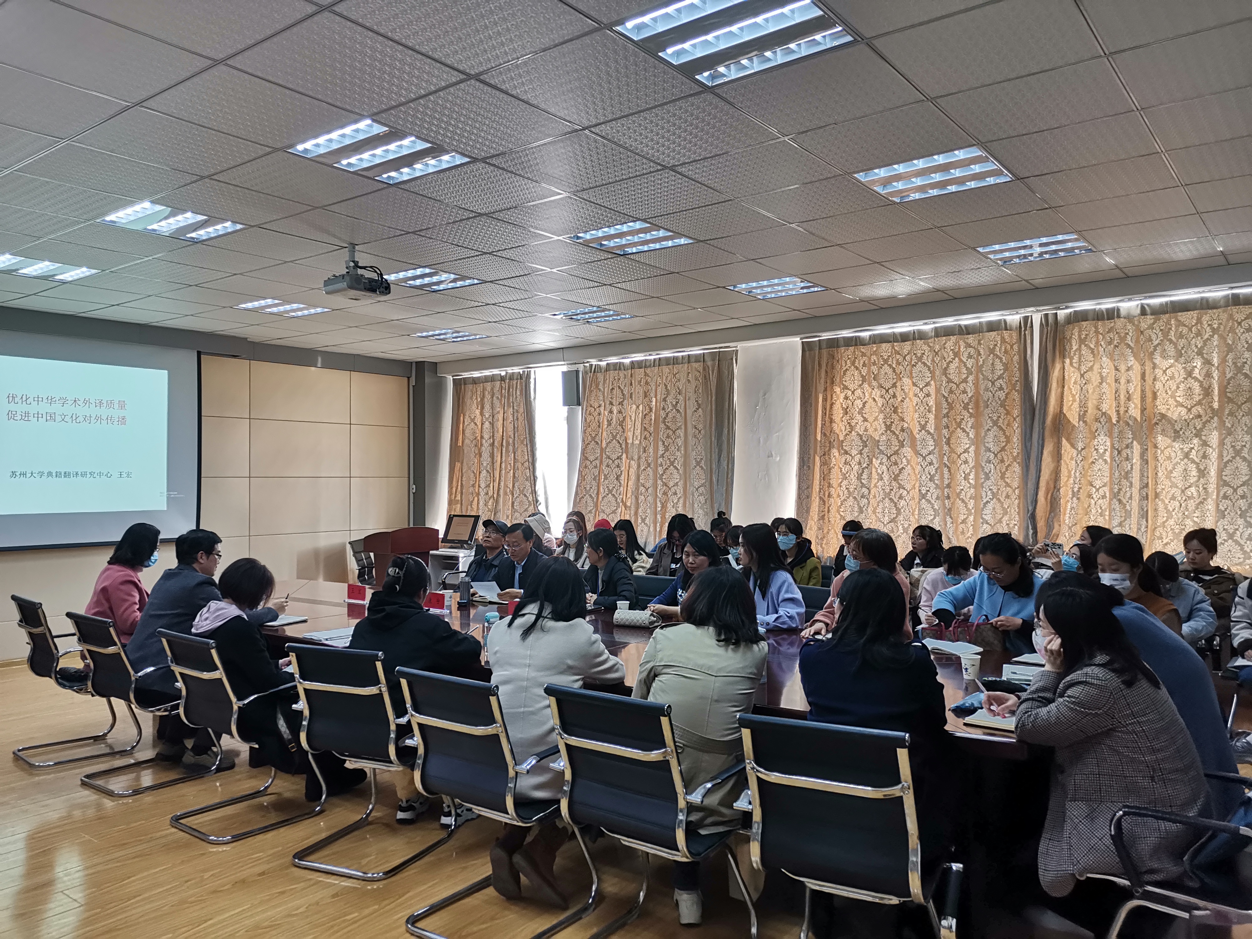 3月14日下午15点,苏州大学典籍英译首席专家、博士生导师王宏教授应学院邀请,在外语学院517会议室做了题为《优化中华学术外译质量促进中国文化对外传播》学术讲座。学院党委书记曲斌艳、校人文社科处副处长戴尊红、学院副院长刘靖教授出席。学院全体研究生及部分教师参加本次讲座。讲座由副院长康宁教授主持。