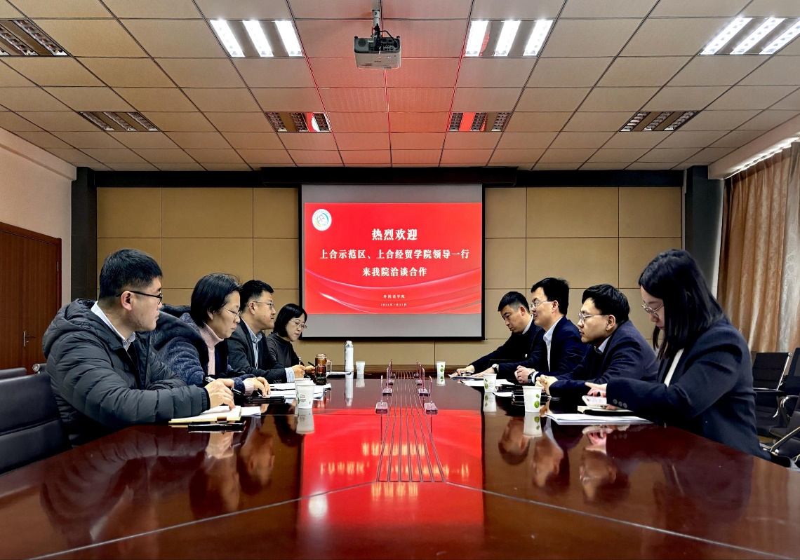 1月31日,上合示范区管委国际交流合作部部长梁超、上合经贸学院院长郑师一行来信誉网赌交流与洽谈合作。澳门信誉最好十大平台党委书记曲斌艳、院长王灏、党委副书记兼副院长马寒、俄语系系主任曹静娴参加了本次会谈。