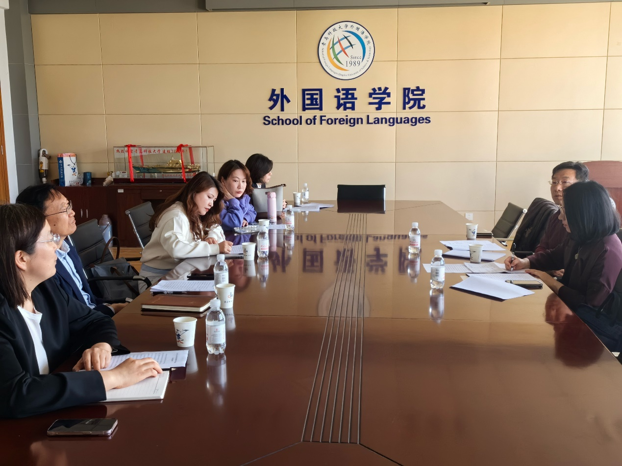 4月26日上午,青岛市外办翻译处副处长李嵩一行二人来信誉网赌调研。调研内容主要针对青岛市政协委员、澳门信誉最好十大平台副院长赵洪娟教授在青岛市政协十四届三次会议的提案内容展开,提案指出要进一步加强在青高校英语及部分非通用语种建设,进一步提升青岛国际传播能力。澳门信誉最好十大平台副院长康宁、赵洪娟,英语系主任王丽,日语系主任班健,德语系主任于豪参加了此次调研会。