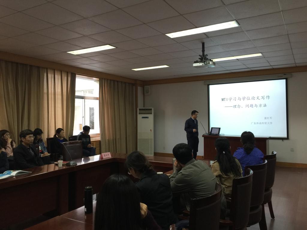 10月26日下午3:30,经管楼313会议室座无虚席。来自广东外语外贸大学的蓝红军教授应邀为信誉网赌MTI翻译硕士师生带来一场精彩的学术报告,报告主题为“MTI学习与学位论文写作”。报告由院长尹洪山主持,副院长任素贞与学院MTI师生参加了报告会。