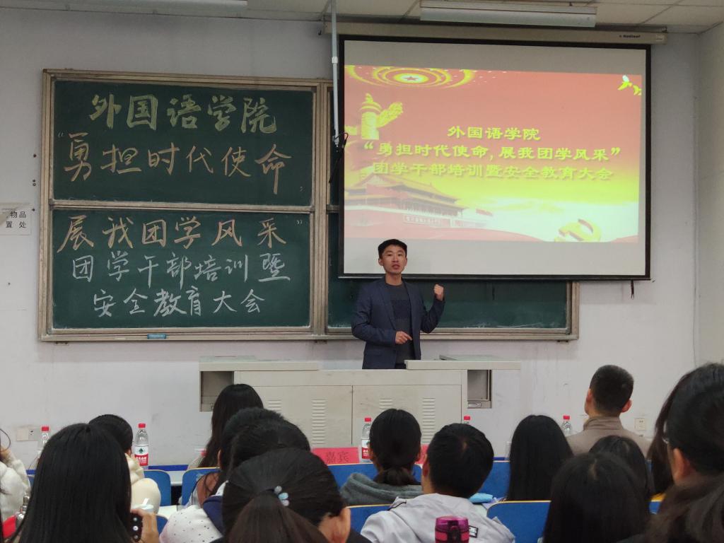 为深入学习贯彻习近平新时代中国特色社会主义思想和党的十九大精神,引导全院师生自觉践行爱国奋斗精神,勇担时代使命,11月13日,澳门信誉最好十大平台在弘毅E303开展了“勇担时代使命,展现青年风采”主题活动。保卫处副处长严增兴,澳门信誉最好十大平台党总支副书记兼副院长宋飞、全体辅导员、学生干部参加了本次活动。
