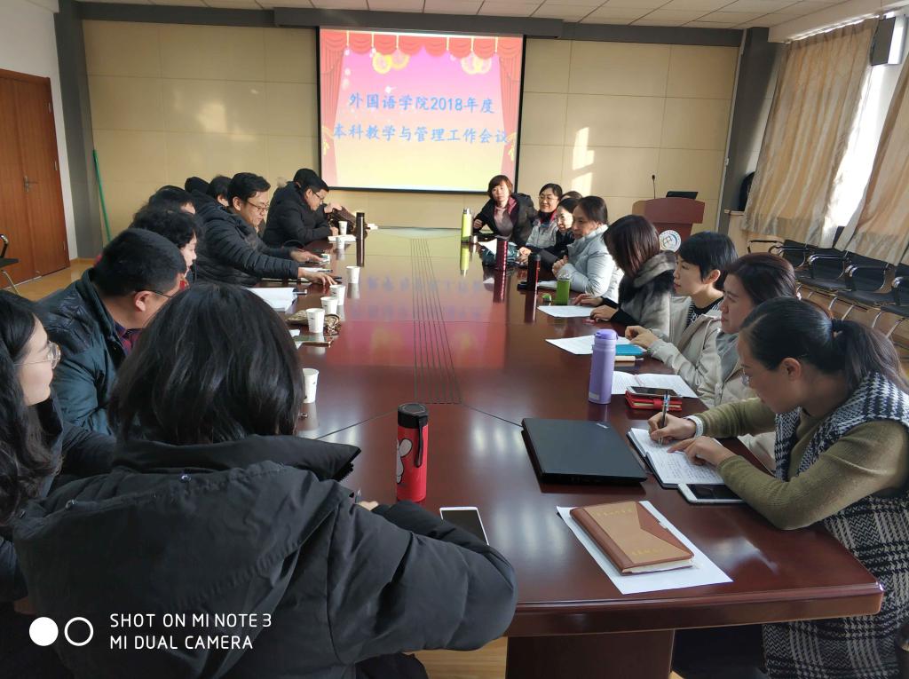 任素贞从本科教学工作、人才培养方案修订、学校新文件的学习、专业建设与团队建设、大学英语教学改革、青年教师培养、学生能力培养、对外交流等方面总结了学院一年来的工作与成绩,对新时代、新理念、新要求下学院面临的困难和存在的主要问题进行了客观分析,提出今后要继续坚持立德树人、以本为本的育人理念,全面落实全国高校思想政治工作会议和全国教育大会精神,不断深化改革,加强人才引进,推动教学科研发展和学科建设。