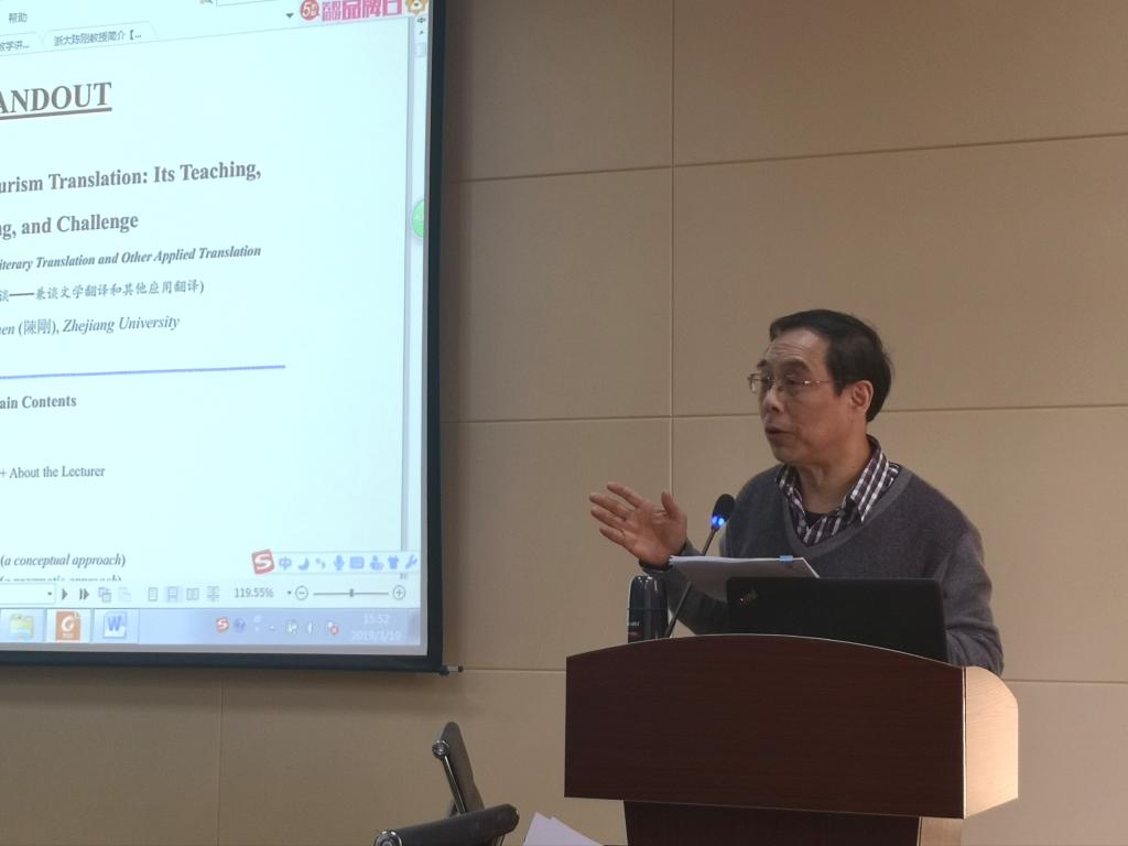 3月19日下午,浙江大学陈刚教授应邀来到学院517会议室,为信誉网赌翻译硕士师生带来了一场题为“旅游翻译教学及问题漫谈——兼谈文学翻译和其他应用翻译”的报告。报告会由吕耀中副院长主持。