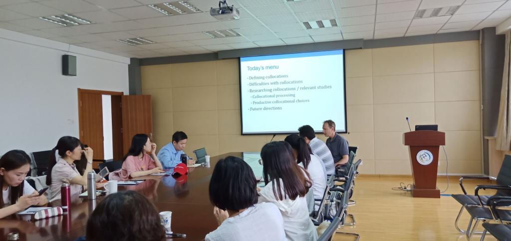 6月20日下午,国际应用语言学知名专家、美国爱达荷州立大学Brent Wolter教授应邀在澳门信誉最好十大平台517会议室作了题为“心理学视域下的二语搭配加工”的学术专题讲座。本次讲座由澳门信誉最好十大平台副院长吕耀中主持,院长尹洪山及部分教师和研究生共同参加了此次讲座。