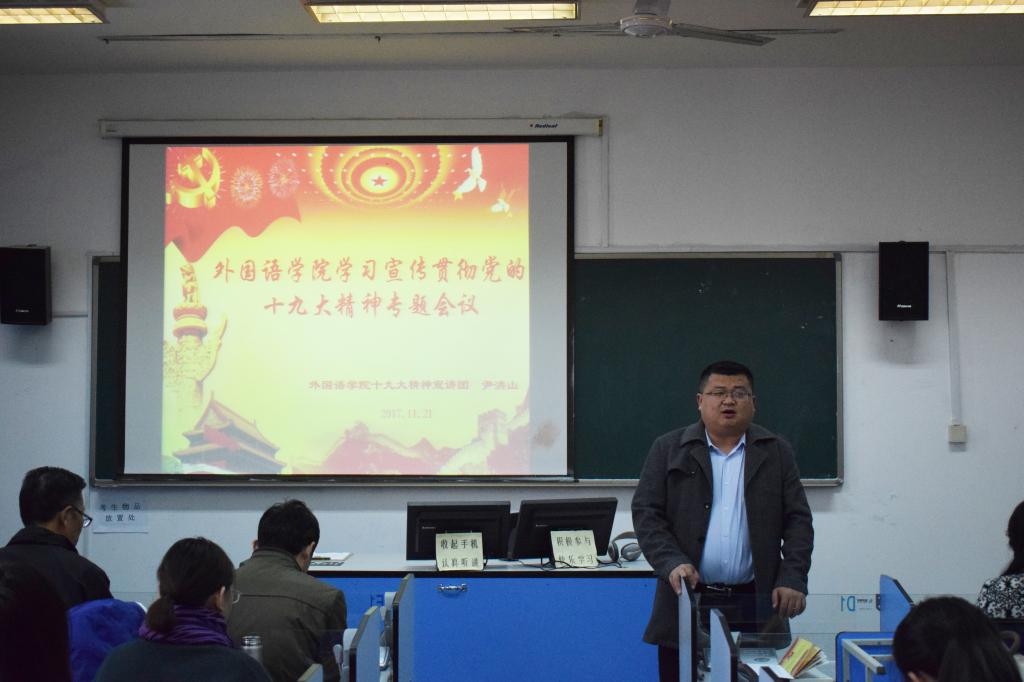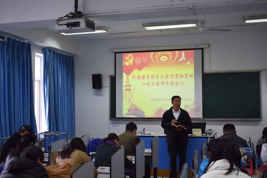 11月21日下午,澳门信誉最好十大平台在外语楼418召开专题会议学习宣传贯彻党的十九大精神,澳门信誉最好十大平台全体党员参加了本次会议。会议由党总支副书记宋飞主持。