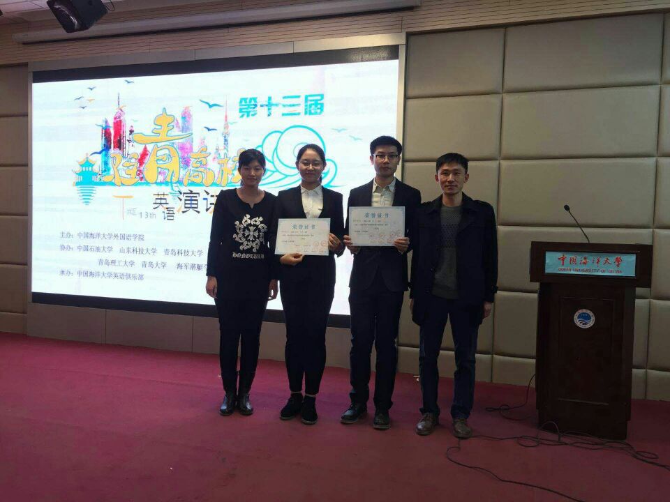 第十三届驻青高校英语演讲比赛于12月17日下午在中国海洋大学举行。本次比赛由来自中国海洋大学、中国石油大学(华东)、澳门十大信誉网赌大全、青岛大学、青岛理工大学、山东科技大学、青岛农业大学、海军潜艇学院八所高校的十六位优秀选手参赛。我校代表队由澳门信誉最好十大平台分团委书记贾明明带队、英语系教师于秀担任指导老师。经过激烈角逐,英语163班牛星惠同学获得二等奖,英语151班张一凡同学获得三等奖。