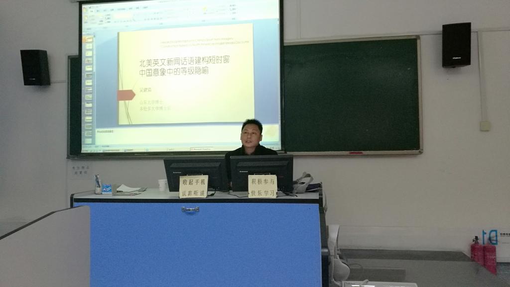 12月20日下午,多伦多大学博士后研究员吴建清博士应邀来我校为广大师生作了题为“北美英文新闻话语建构短时窗中国意象中的等级隐喻”的学术报告。报告由澳门信誉最好十大平台副院长吕耀中主持,院党总支书记姜德杰、院长尹洪山,部分教师以及研究生参加了本次学术报告。