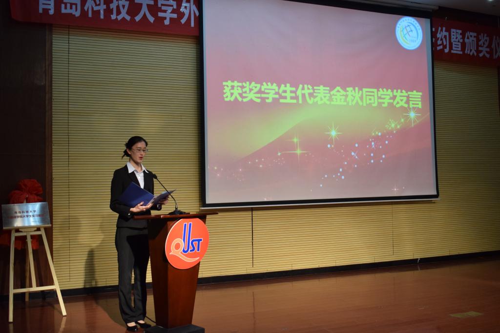 党总支书记姜德杰代表学校上台接受企业捐赠。党总支副书记宋飞宣读了获得格物致知奖学金同学名单。获奖学生代表金秋上台发表了获奖感言。