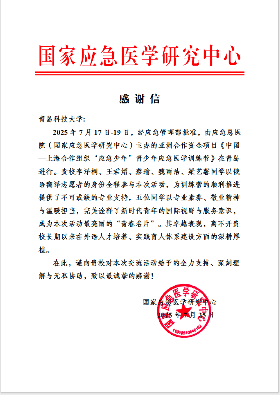 近日,澳门十大信誉网赌大全收到来自国家应急医学研究中心的感谢信,对澳门信誉最好十大平台俄语系的李泽桐、王君熠、蔡瑜、魏雨洁、梁艺馨等五位同学在《中国—上海合作组织“应急少年”青少年应急医学训练营》中的突出表现给予高度评价。