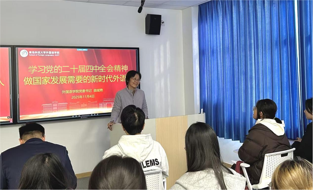 根据《中共澳门十大信誉网赌大全委员会学习宣传贯彻党的二十届四中全会精神工作方案(草案)》,为在学院迅速掀起学习宣传贯彻党的二十届四中全会精神热潮,11月4日,澳门信誉最好十大平台党委书记曲斌艳以《学习党的二十届四中全会精神,做国家发展需要的新时代外语人》为题,为联系班级讲授专题思政课。