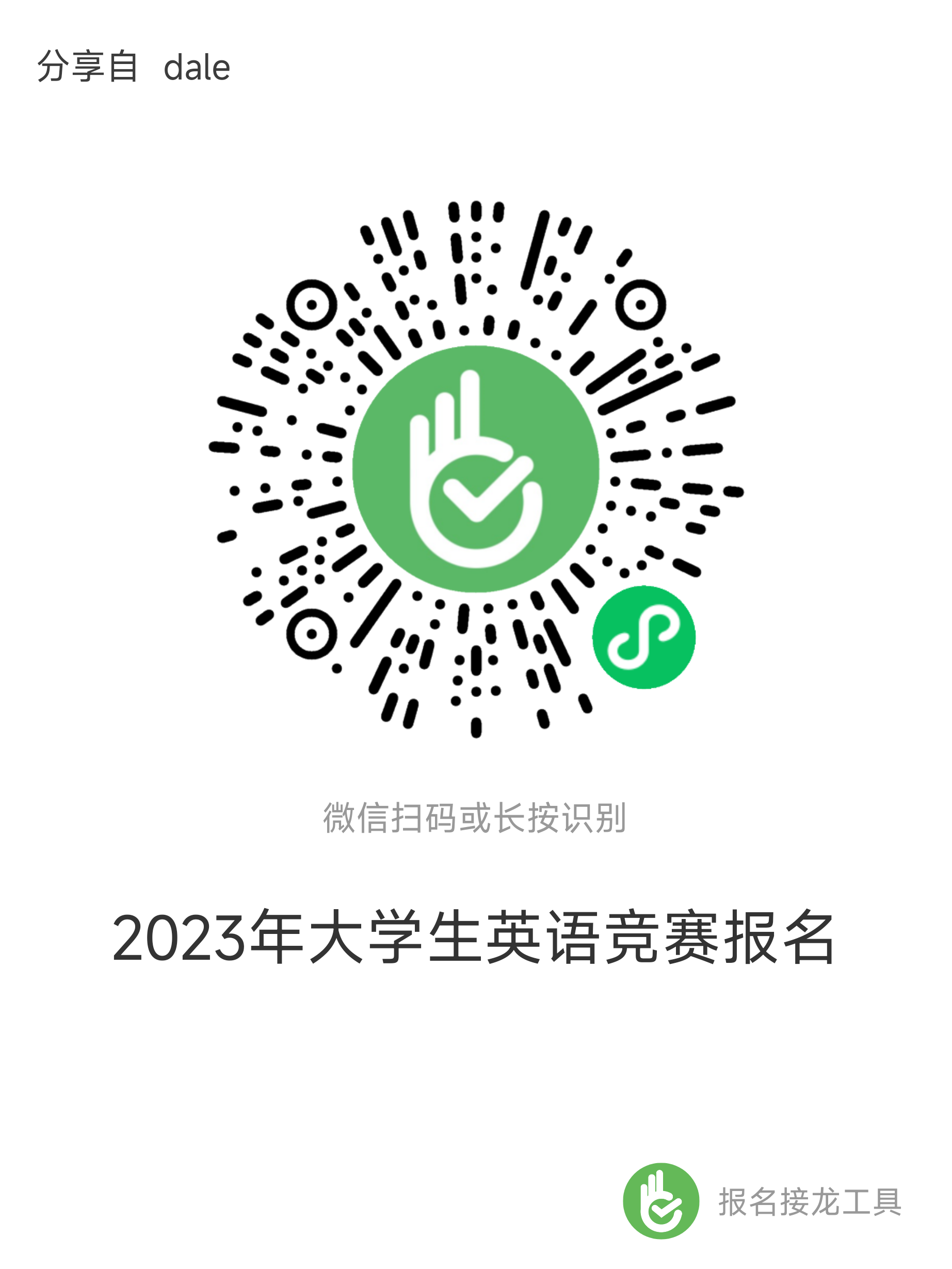 1. 报名:从2023年3月9日-2023年3月31日,通过报名接龙(微信“接龙工具”小程序,链接:https://rl.uil.ink/?r=YJ9rJuXJe或者识别下方报名图片)填写参赛学生名单、竞赛类别等信息,每人仅限填报一次,信息务必准确,报名后务必按照校区实名(班级姓名)加入对应的QQ群,群内会发布最新通知信息。报名逾期不候。根据《2023年全国大学生英语竞赛(NECCS)通知》规定,本次竞赛全部收费为50元/人。