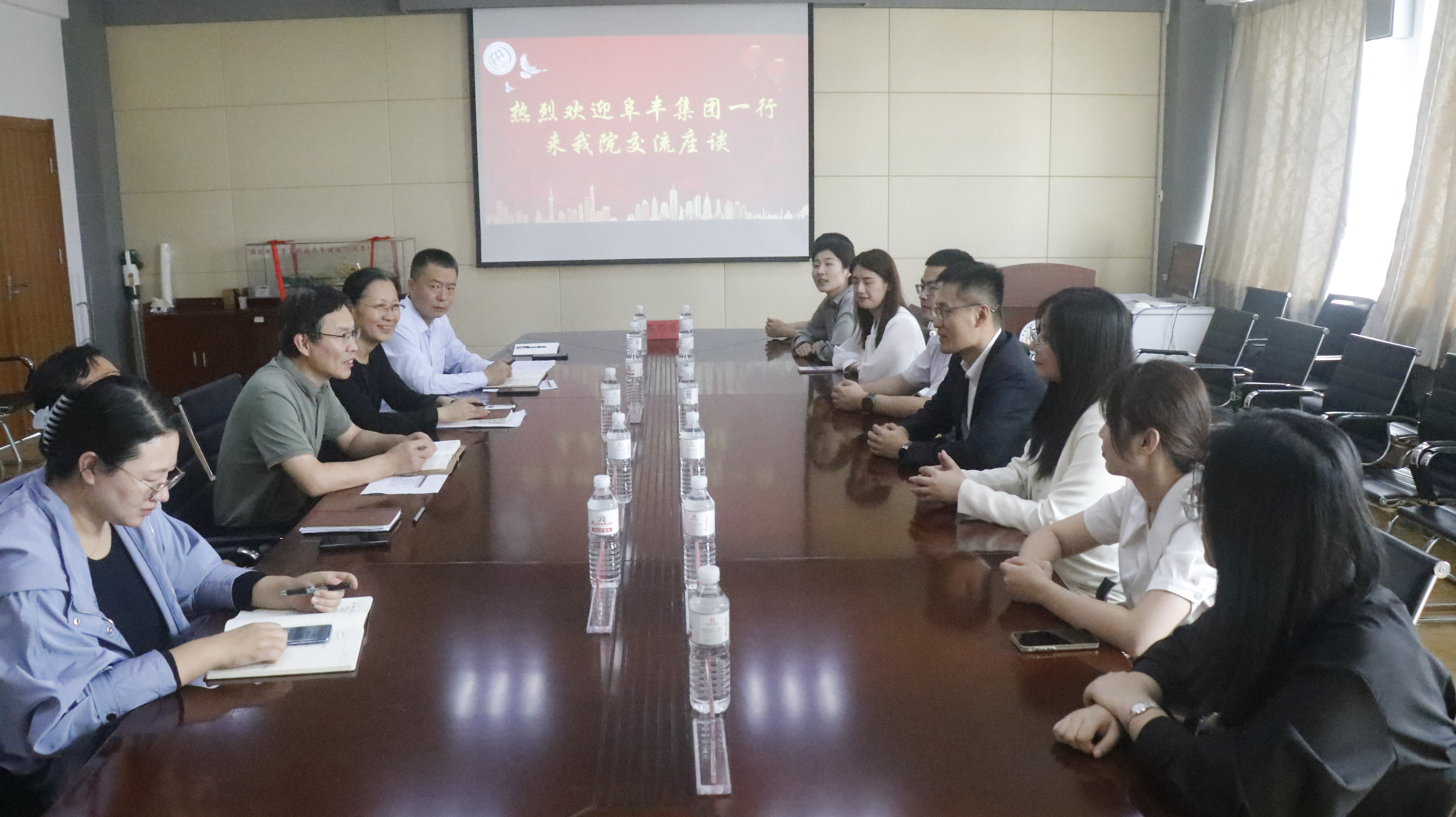 为加强校企合作,促进资源优势互补,探讨校企合作的新模式,2023年9月26日,阜丰集团营销总公司全球人力资源总监夏龙飞率团一行八人来学院开展交流合作。院长尹洪山、学院党委书记曲斌艳、党委副书记兼副院长刘尧、副院长康宁、团委书记和学工办主任刘妍君参加座谈。