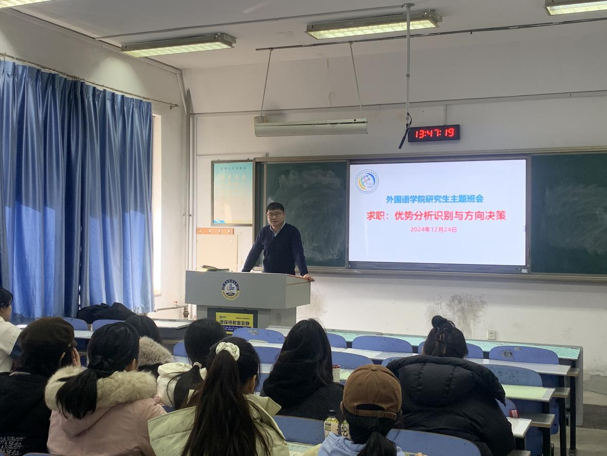 为进一步帮助澳门信誉最好十大平台研究生明晰未来求职发展路径,提高自我认知水平与职业探索能力,充分调动毕业生就业积极性,澳门信誉最好十大平台于12月24日在弘毅楼B106举办“求职:优势分析与方向决策”就业指导主题班会。主题班会由研究生辅导员、学院党委副书记兼副院长马寒主讲,全体2023级研究生参加。