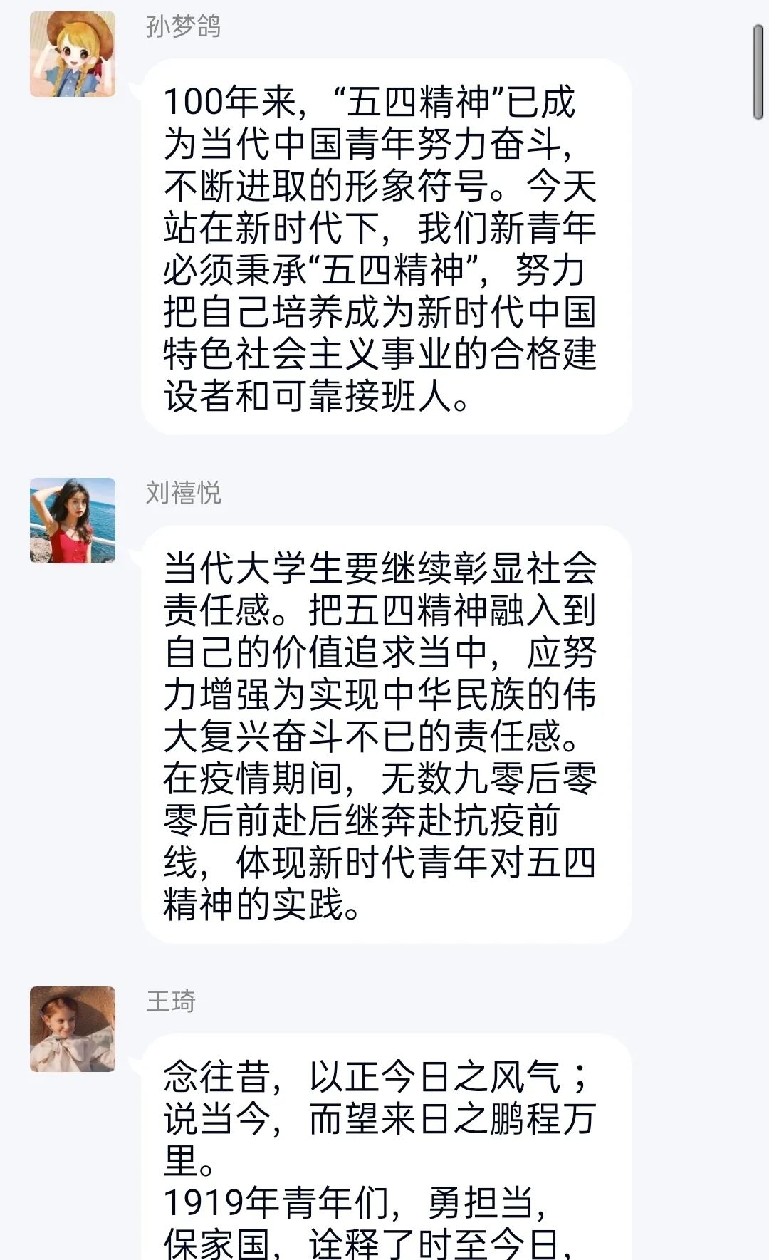 伟大的时代需要一代代人接续奋斗,共同建设。今日之青年,处在大好时代,当不负青春韶华,争做时代先锋。百年凌云志,吾辈当秉承。我中华儿女也应有所志气,奋勇博青春,有一分热,发一分光,就令萤火一般,在黑暗里发一点光,不必等候炬火。青春由磨砺而出彩,人生因奋斗而升华,愿以吾辈之青春护卫这盛世之中华,传承五四精神,绽放青春力量!