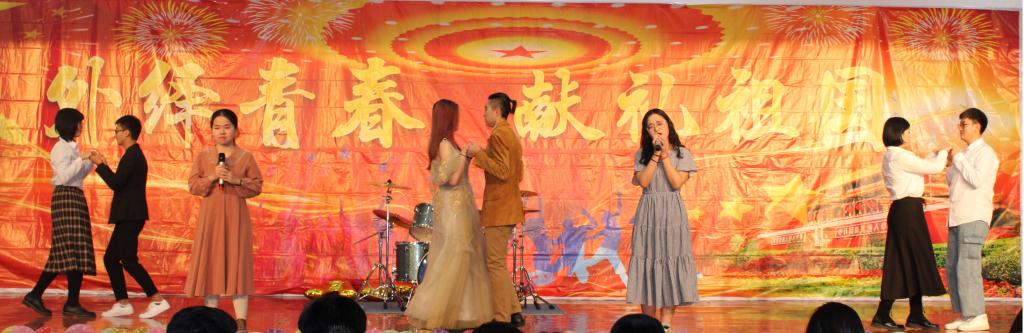 节目以老师们祝福视频开场,赢得了新生们的共鸣。晚会的节目内容形式多样、丰富多彩。韩语系带来的韩国乐器传统节目《四物乐》将一片喜庆融洽的气氛带入了现场;教职工子女带来舞蹈节目《拾豆豆》,俏皮可爱的孩子们跳出了童真与欢乐;外院学子带来歌曲《青科姑娘》,曼妙的歌声唱出了外院学子的激情与活力;手语操节目《我和我的祖国》献给无声世界的人们暖心的关怀。
