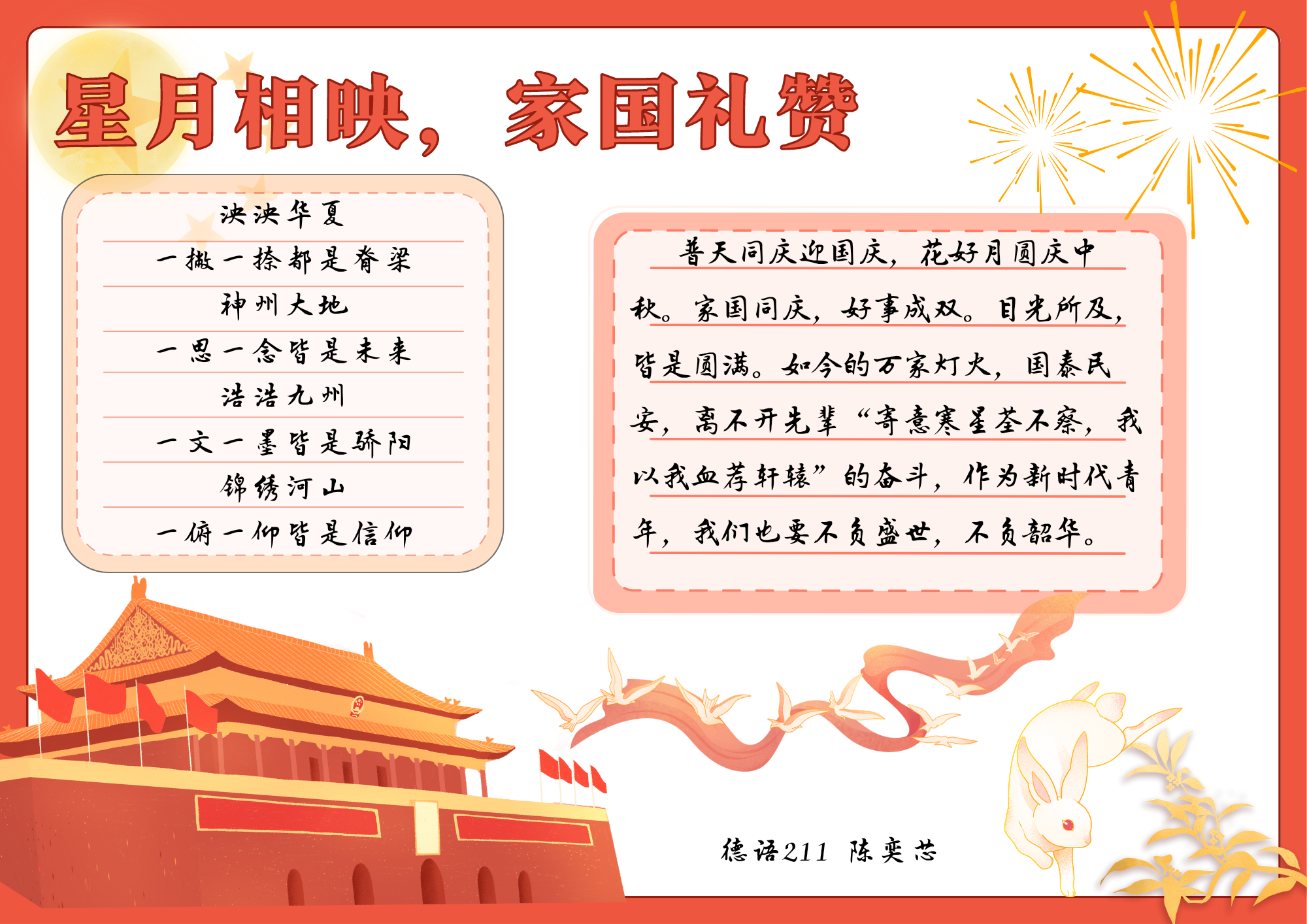 为加强对学生的爱国主义教育和民族精神教育,澳门信誉最好十大平台开展“挺膺担当砺青春,盛世华诞谱新章”中秋国庆双节主题教育系列活动,弘扬爱国主义精神,传承优秀传统文化,增强文化自信,厚植学生爱党、爱国情怀。