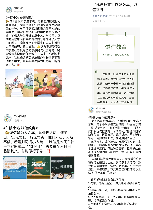 澳门信誉最好十大平台注重宣传教育,在微信和QQ公众平台上相继推出“诚信还款”“预防金融诈骗”“诚信考试”等内容,及时推送相关主题活动和动态。通过宣传的力量,让同学们充分认识开展高校学生资助诚信教育主题活动的意义,提高学生诚信意识和责任意识,营造“人人知诚信,人人讲诚信”的良好氛围。