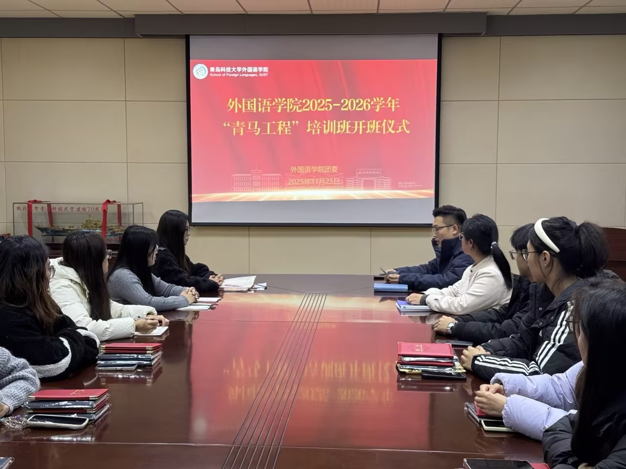 11月25日,澳门信誉最好十大平台2025-2026学年“青马工程”培训班开班仪式在517会议室举行。学院团委副书记王玉凯主持仪式并讲话,往期青马优秀学员及本期青马学员共同参加仪式。