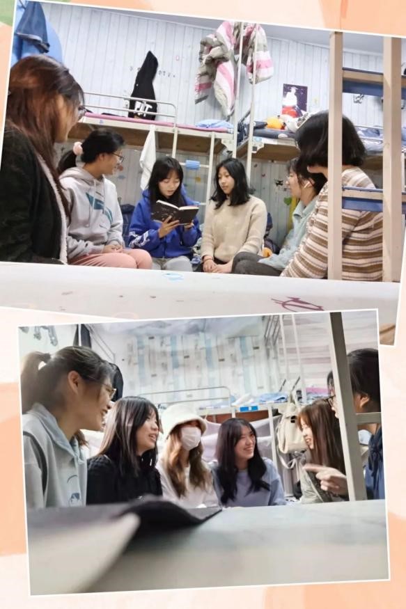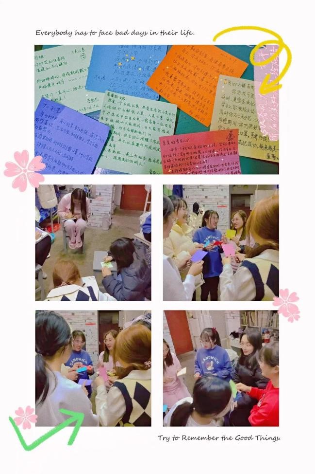 “周末我们班每个宿舍都进行了团建活动,通过这次团建活动,每个宿舍成员都对彼此的舍友有了更深的了解,通过积极的自我介绍,相互评价彼此,每个人都找到了自己和别人的发光点,宿舍更加团结友爱。阳春已至,万事可期。”——英语211班宿舍