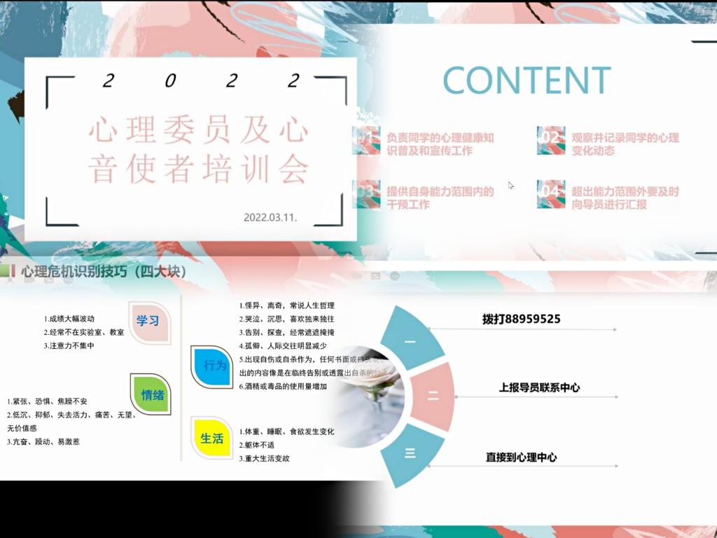 为落实心理健康中心进一步关注学生心理健康的要求,提高澳门信誉最好十大平台心音使者与各位宿舍长发现同学们心理问题的能力,澳门信誉最好十大平台于3月11日开展了宿舍长及心音使者线上培训会。